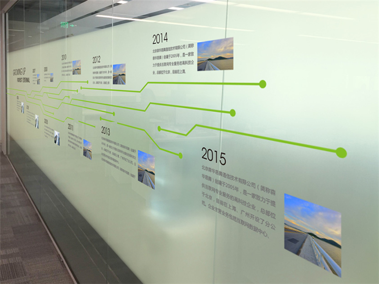 貿(mào)易公司的文化墻當(dāng)然要時(shí)尚前衛(wèi),搭配前沿,主題色選對(duì)了,傳達(dá)效果事半功倍,案例主要是做過(guò)道文化軟裝,包括:公司介紹,發(fā)展歷程、團(tuán)隊(duì)實(shí)力展示,公司進(jìn)出口產(chǎn)品類型介紹、深圳公司項(xiàng)目板塊展示等。針對(duì)過(guò)道,裝修采用的玻璃隔斷制作而成,考慮到隱私和展示結(jié)合,設(shè)計(jì)師使用了磨砂紙噴繪工藝,現(xiàn)場(chǎng)粘貼,其他文化墻內(nèi)容采用亞克力雕刻和UV工藝,綠色乳膠漆墻面做背景色,時(shí)尚清晰,健康向上。