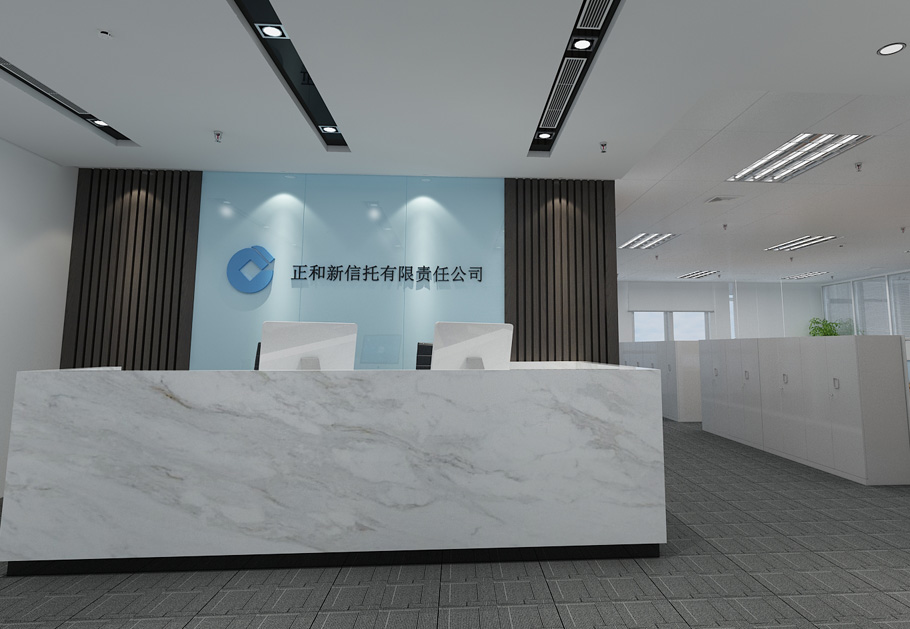 負(fù)責(zé)前臺logo墻面設(shè)計施工,采用淺藍(lán)色鋼化玻璃做底部,與行業(yè)屬性符合,兩側(cè)采用棕色長城板輔助給人一種安全、 可靠感受,符合企業(yè)信托公司要表達(dá)給客戶的信息。字體采用黑色宋字體,莊重而不失風(fēng)格。